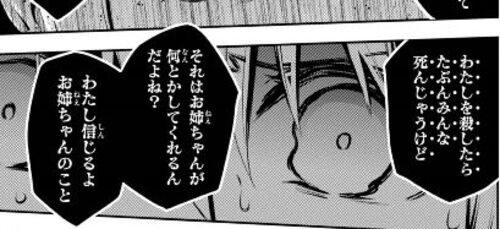 エインズワースの目的は世界の救済だ。 貴様のしていることは、世界に対する反逆だ。ま、とりあえず決めてくださいよお姉さん。 簡単な話でしょう? 世界を頃すか、一人を頃すかだ。今一度問おう。 ミユ様か、人類か、選ぶが良い。 クロの答え 迷うまでもな…